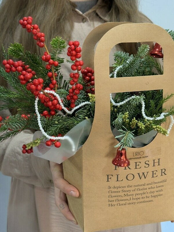 Новогодняя композиция из нобилиса, мережки, илекса красного и декора – это не просто украшение, а волшебный портал в атмосферу рождественской сказки. Сочетание благородной зелени нобилиса, изящной мережки, ярких акцентов красного илекса и сверкающего декора создает неповторимую симфонию праздничного великолепия.