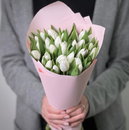 Букет из 31 белого тюльпана в нежной розовой упаковке