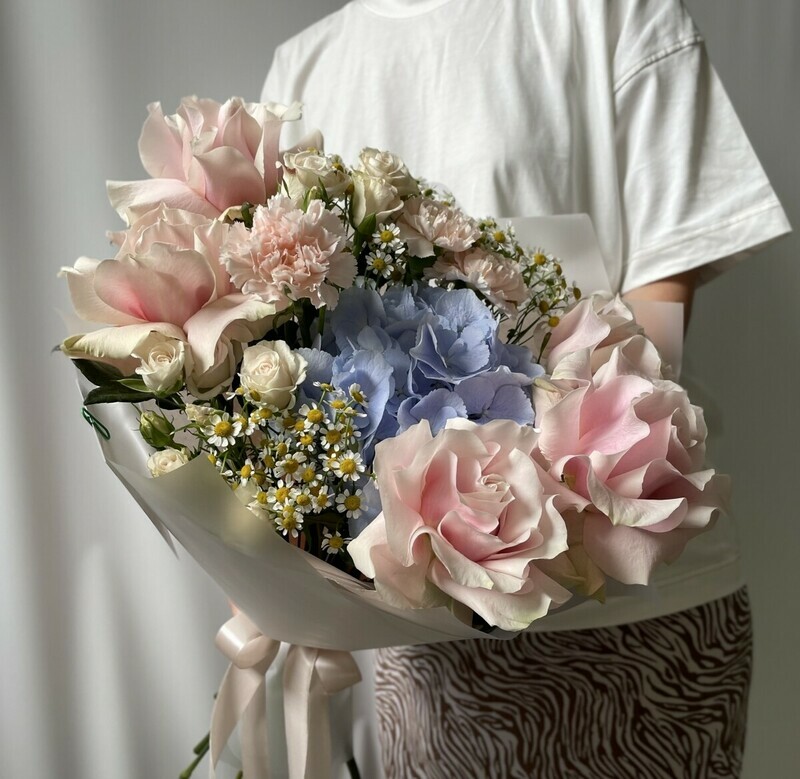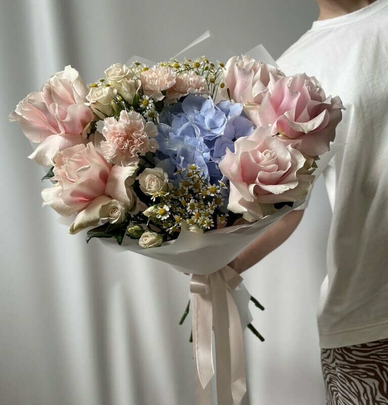 Букет из голубой гортензии и роз