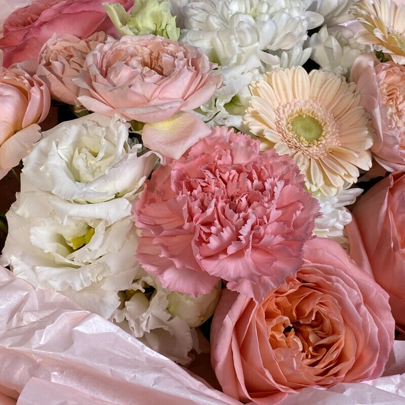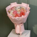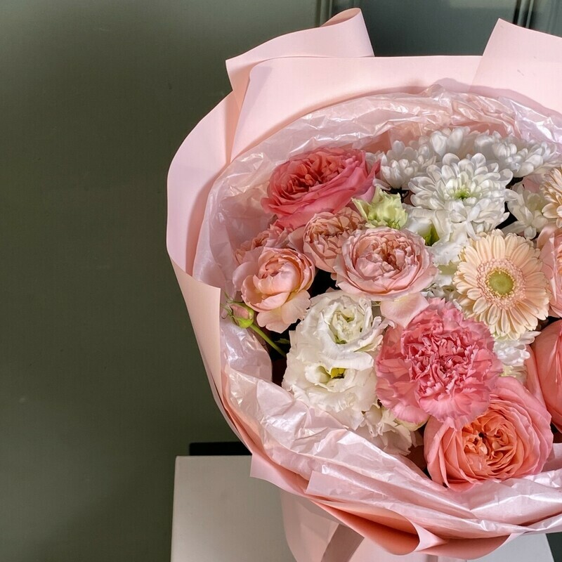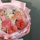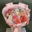 - Букет с пионовидной розой, хризантемой и эустомой