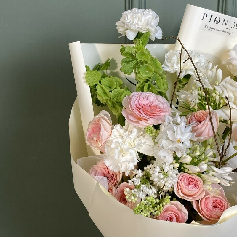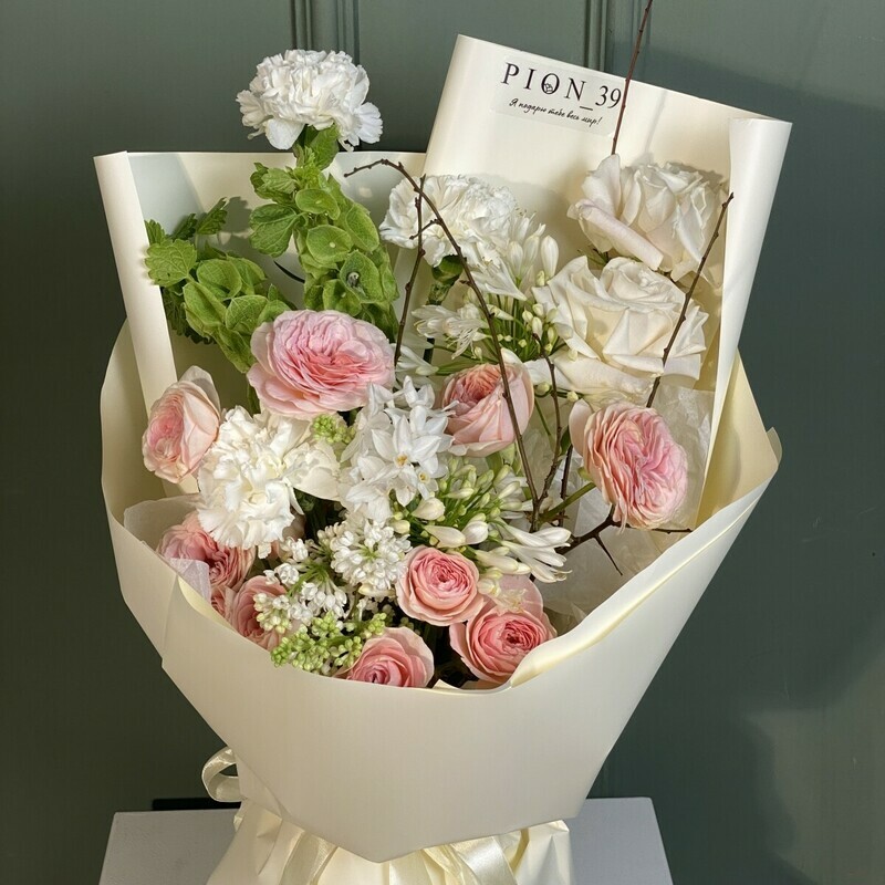 Букет из кустовых пионовидных роз, нарцисса и сирени