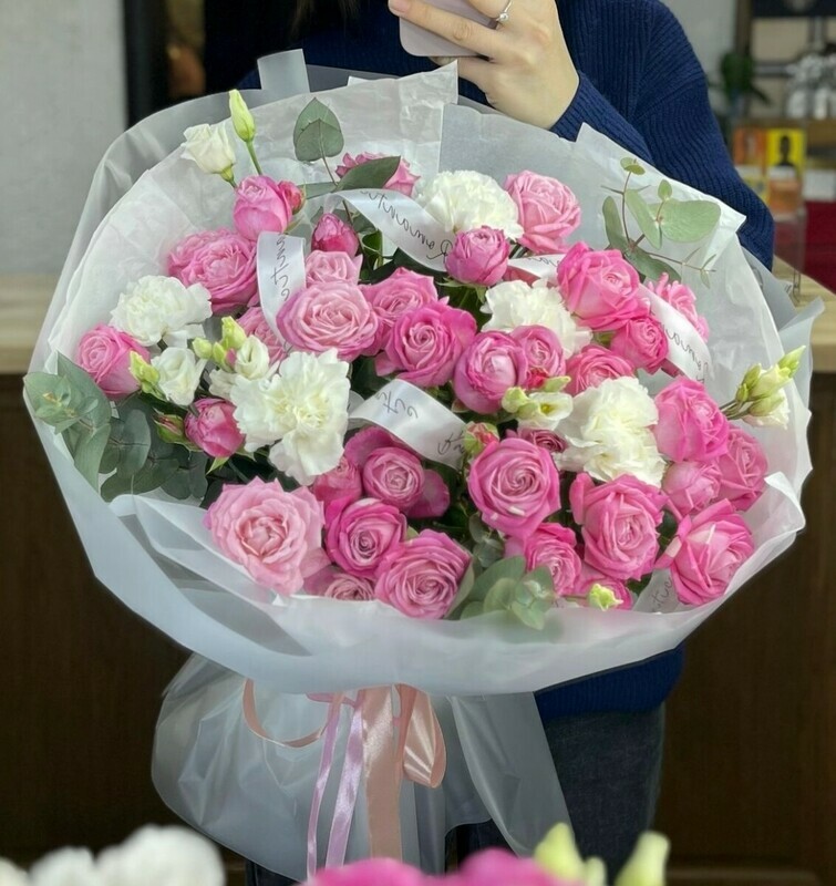 Невероятной красоты кустовая роза в сочетании с нежной эустомой, диантусами и эвкалиптом . Роза очень стойкого сорта.
