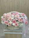 Премиальная корзина с великолепным составом из стойких крупных голландских роз в сочетании с нежными цветами гортензии, диантусов и кустовой розы.