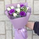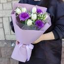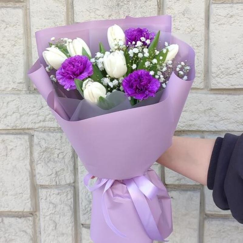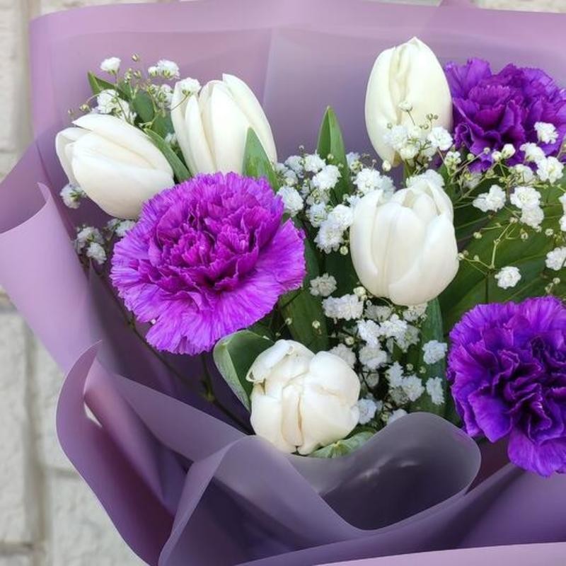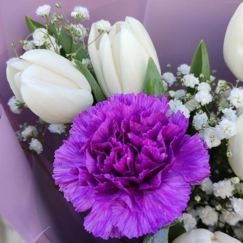Белые тюльпаны в сочетании с фиолетовыми диантусами выглядят стильно и загадочно !