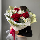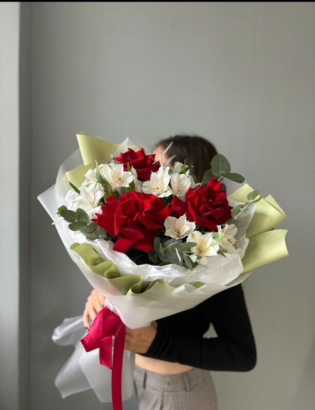Нежный букет с розами ,эвкалиптом и альстромерией
