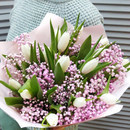 Букет из белоснежных тюльпан и множества цветов розовой гипсофилы создаёт радостное весеннее настроение !
