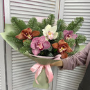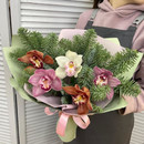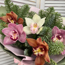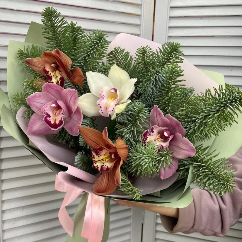 Нежные орхидеи и пушистая ароматная голубая ель Нобилис - оригинальный зимний букет, который будет очень долго радовать свежестью и красотой !