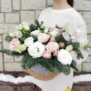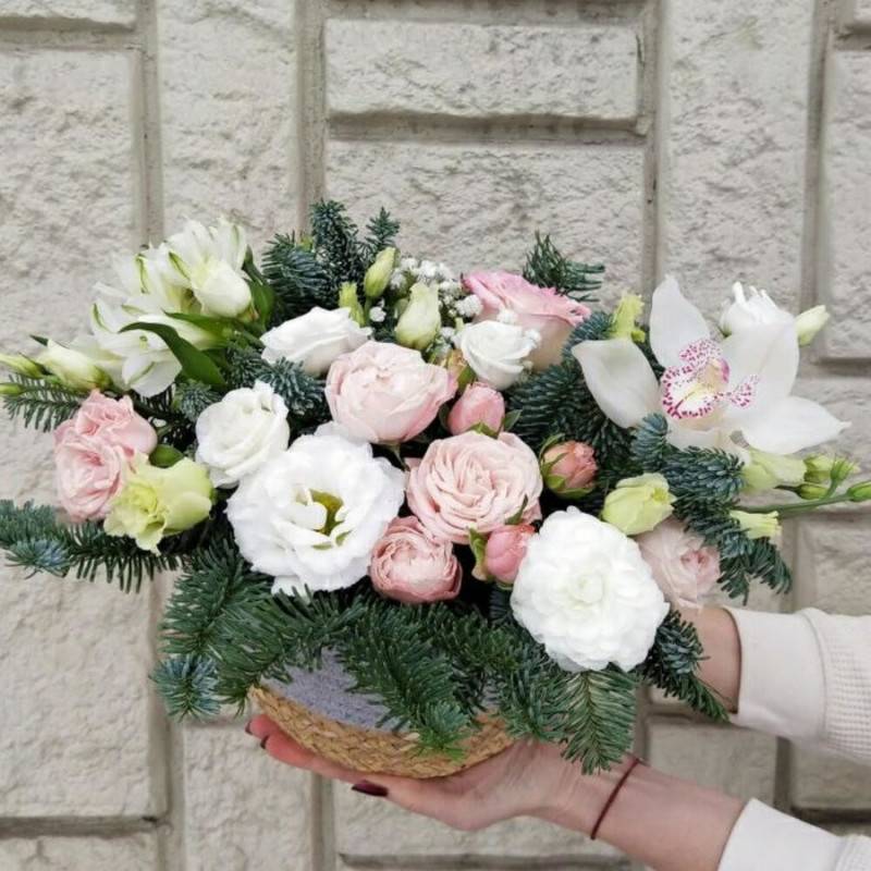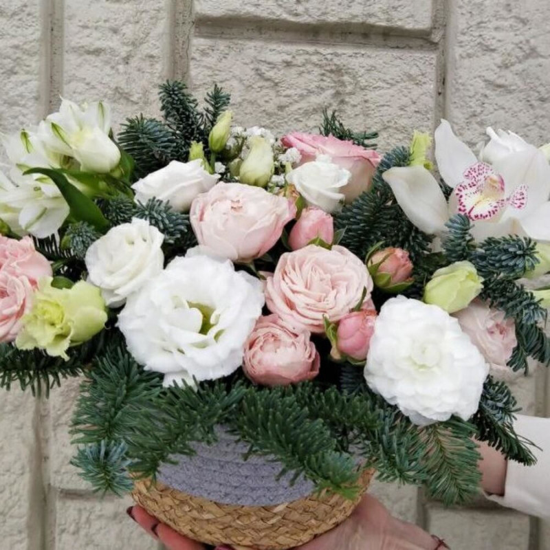 Сочетание нежных цветов и веточек ароматной пихты удивит и подарит праздничное настроение !