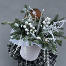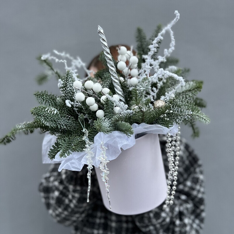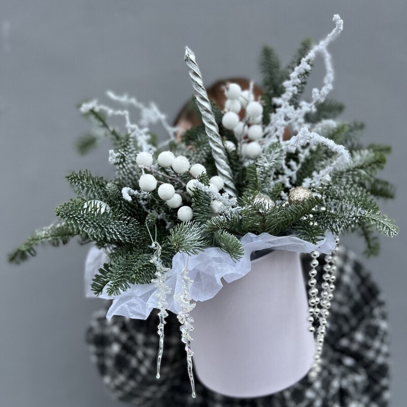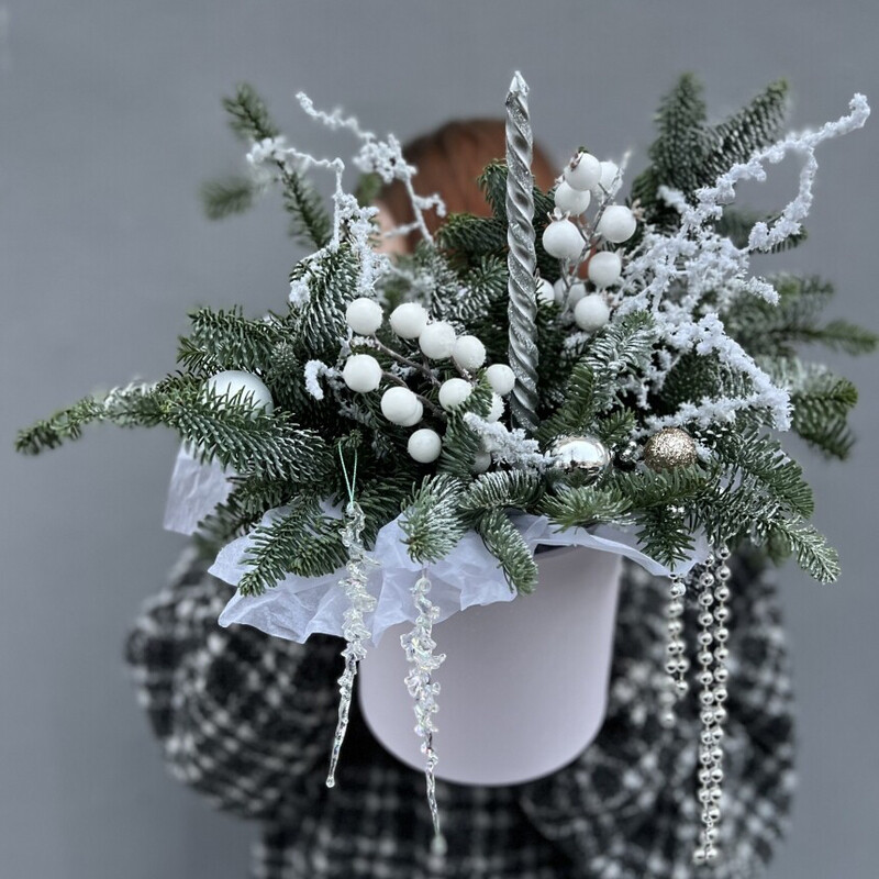 Многослойная история, где пушистый нобилис и воздушный аспарагус задают невесомую мелодию. Серебристая свеча и хрустальные сосульки вносят ноты блеска и холода. А сочный аккорд ягод и шаров, перекликающийся с мягким жемчугом бус, звучит жизнеутверждающим и радостным финалом. Композиция для тех, кто ценит сложность, текстуру и благородную палитру.