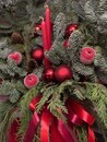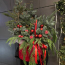 Шикарная сказочная композиция из нобилиса и ароматной туи в шляпной бархатной коробке с яркими игрушками принесёт в ваш дом сказочное настроение
