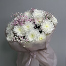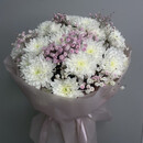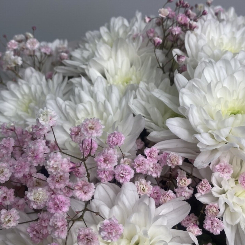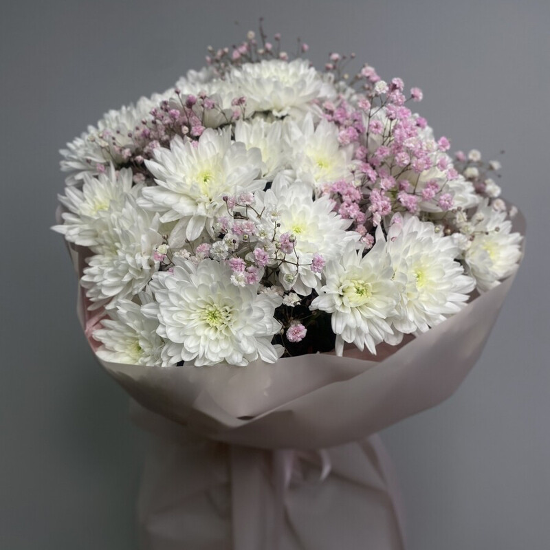 Нежные хризантемы создают атмосферу свежести и легкости в доме, а розовая гипсофила ставит акценты и придает яркости интерьеру.
