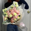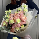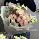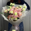 Этот букет — диалог двух текстур. Пышные, бархатистые пионовидные розы, напоминающие старинные парковые цветы, встречаются с изящными и графичными соцветиями кустовой гвоздики (диантуса). Мягкая роскошь и четкий ажурный рисунок создают современную и нежную композицию, полную очарования и гармонии.