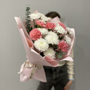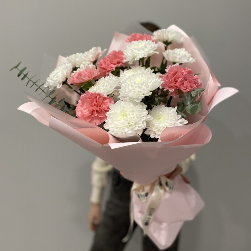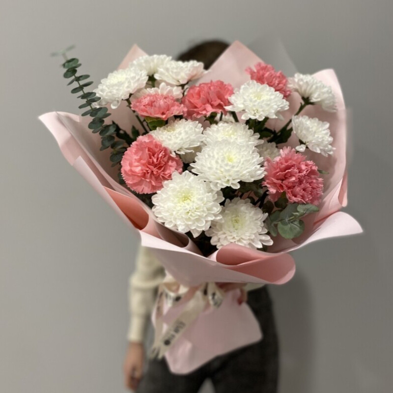 Идеальный контраст: нежность белых облаков и дерзкая вспышка розового восторга. Этот букет — о том, что в искренности есть место страсти, а в нежности — сила.