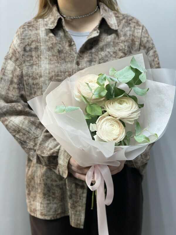 Нежный букет из ранункулюсов с ароматным эвкалиптом