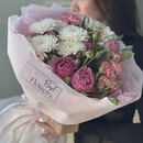 Букет из пионовидных кустовых роз, хризантем и альстромерии, стандартный