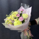 Букет-облако с оттенком ванили и весенней свежести. Кремовая маттиола окутывает ароматом, розовые диантусы дарят нежность, а белые розы — чистоту чувств.