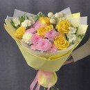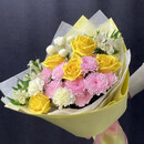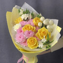 Неожиданное и стильное сочетание: пастельно-розовая основа (кустовая хризантема), воздушно-белые акценты (альстромерии, диантусы, «Ньютон») и яркий жёлтый взрыв — розы в фактурном жёлтом фоамиране. Фоамиран не только поддерживает цвет, но и добавляет композиции скульптурности и дерзости. Букет получается пышным, солнечным и очень нарядным — для тех, кто не боится выделяться.