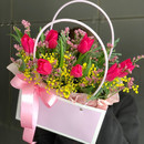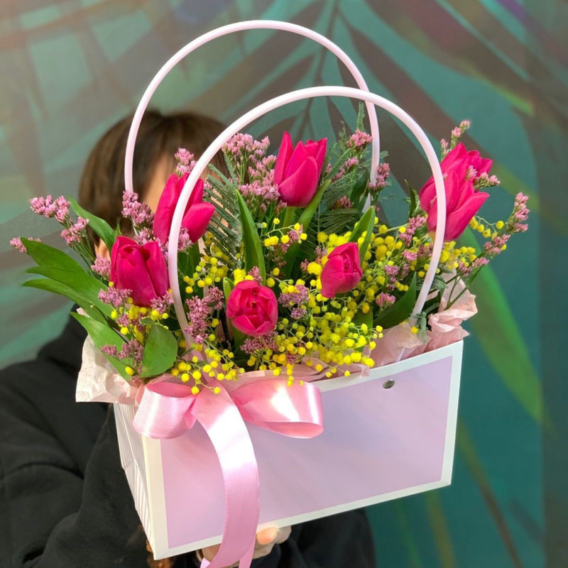 Яркое сочетание оттенков тюльпанов и воздушной ароматной мимозы в стильной сумочке