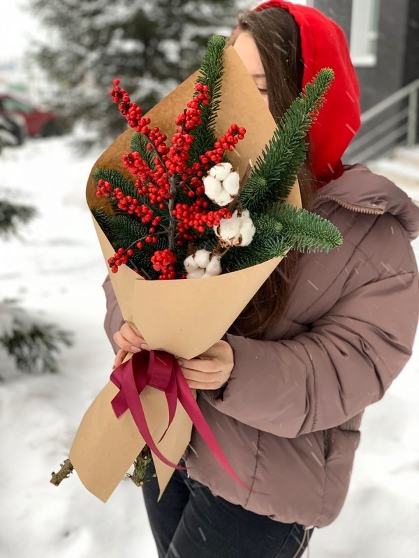Этот красивый букет включает в себя свежие цветы нобилис, илекс и хлопок, которые радуют глаз и создают уютную атмосферу. Он упакован в стильную крафтовую упаковку и украшен яркой лентой, что делает его идеальным подарком для любого случая.