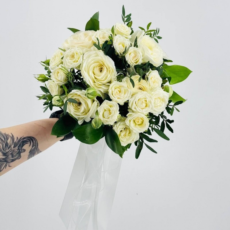 Букет невесты из нежных ранункулюсов и белых кустовых роз. Свадебный букет, стандартный