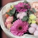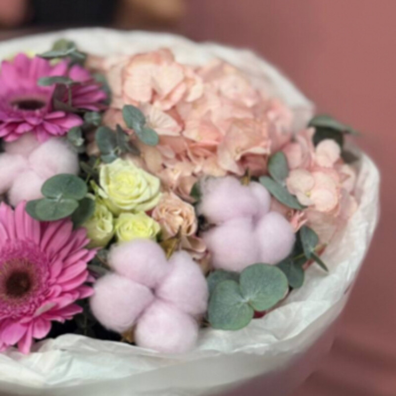 Авторский букет с герберами — изысканная композиция, объединяющая нежность гортензии, яркость герберы и утончённость роз. Подходит для любого случая и идеально дополнит атмосферу праздника.