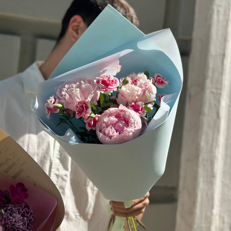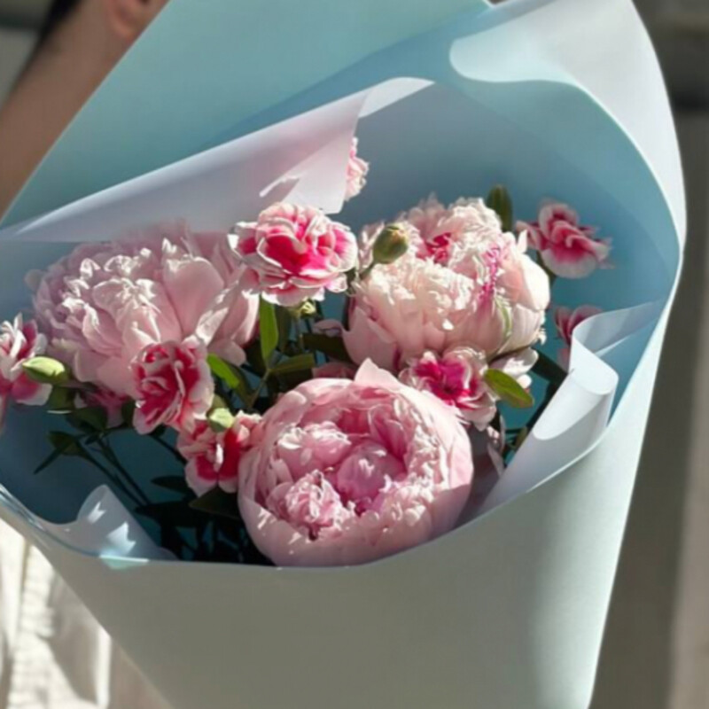 Букет «Пионы и диантусы» — изысканная композиция из пышного пиона и элегантной кустовой гвоздики, украшенная атласной лентой и фисташкой. Идеален для выражения чувств и украсит любой интерьер. Подходит для любых случаев и порадует каждого.