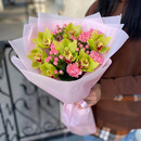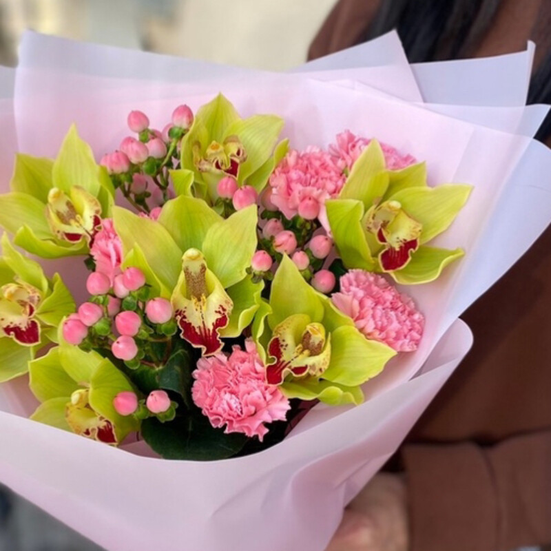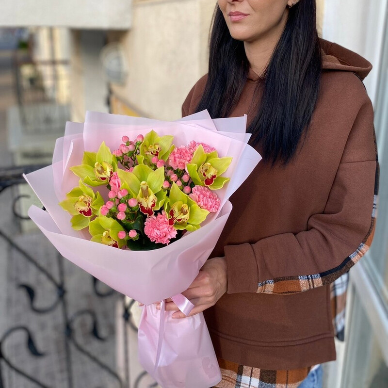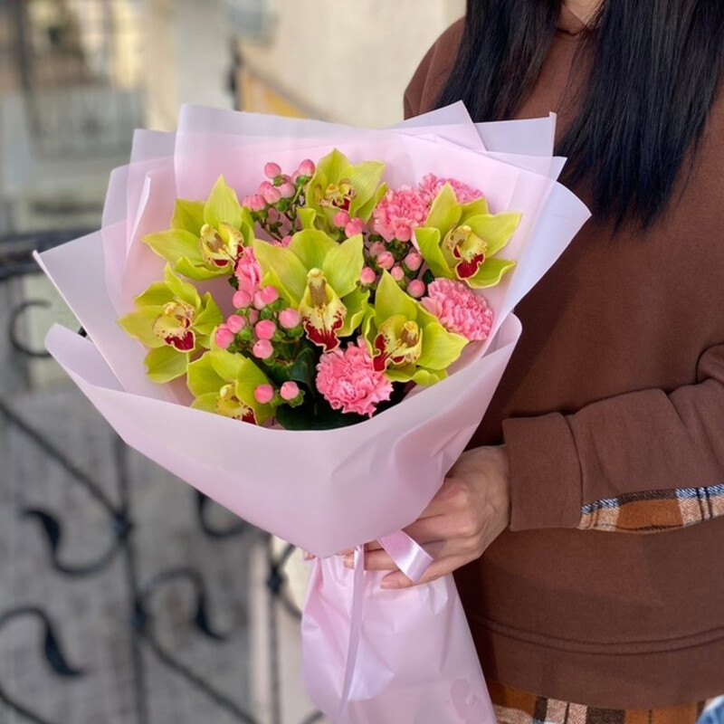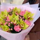 Букет «Орхидея и диантусы» — это изысканная композиция, объединяющая нежность орхидеи Цимбидиум и утончённость гвоздики. Дополнена зеленью гиперикума и элегантной атласной лентой. Подходит для любого случая и станет прекрасным подарком для близких.
