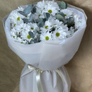 Букет из стойких хризантем и зелени подарит хорошее настроение!