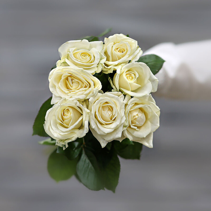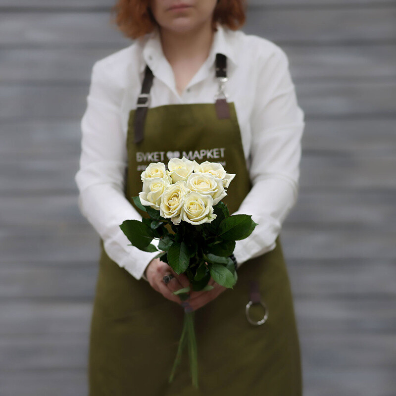 - Букет из 7 белых роз (Россия) с лентой 60 см