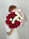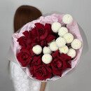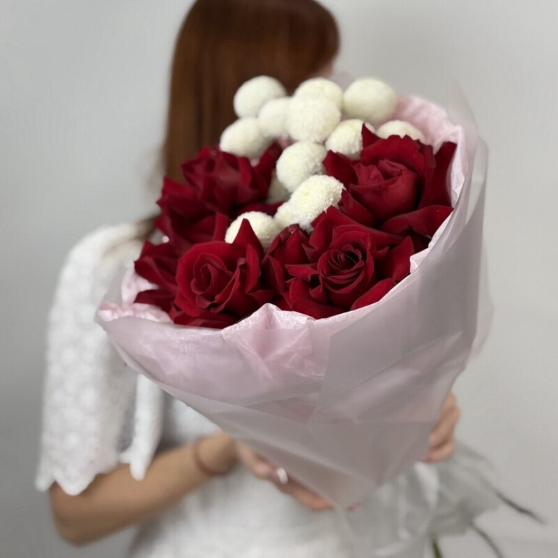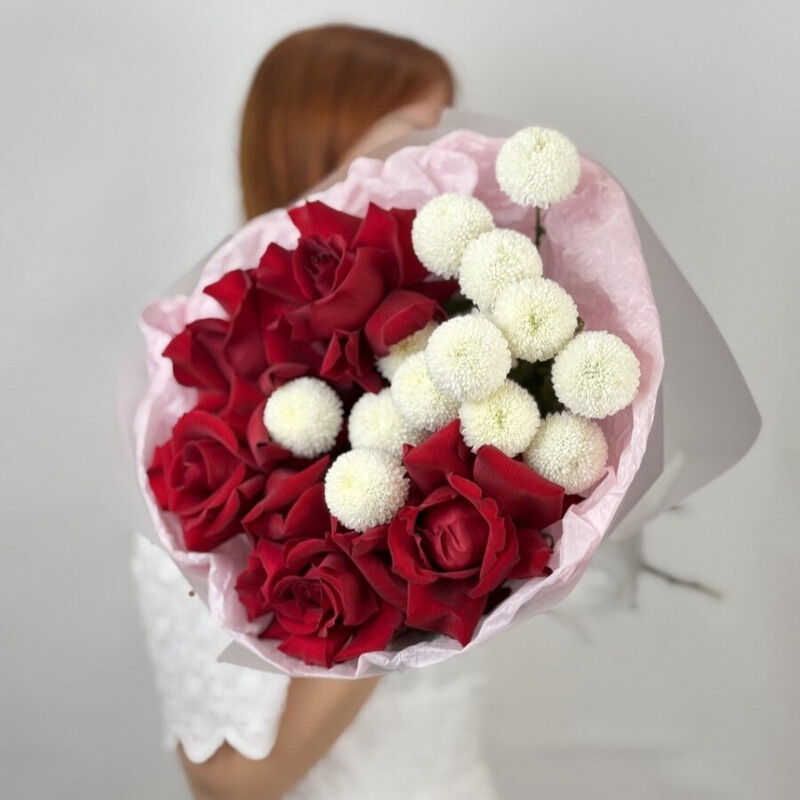 - Яркий букет из красных роз и белых хризантем Пуговка