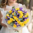Этот изысканный букет включает в себя нежные ирисы, великолепные розы кустовые пионовидные и ароматный эвкалипт. Сочетание ярких цветов и зелени создает утонченный и элегантный образ. Упакованный в матовую пленку, этот букет станет прекрасным подарком для любого случая.