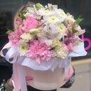 - Кустовая роза, хризантема, альстромерия, нежные диантусы в шляпной коробке
