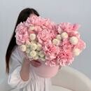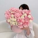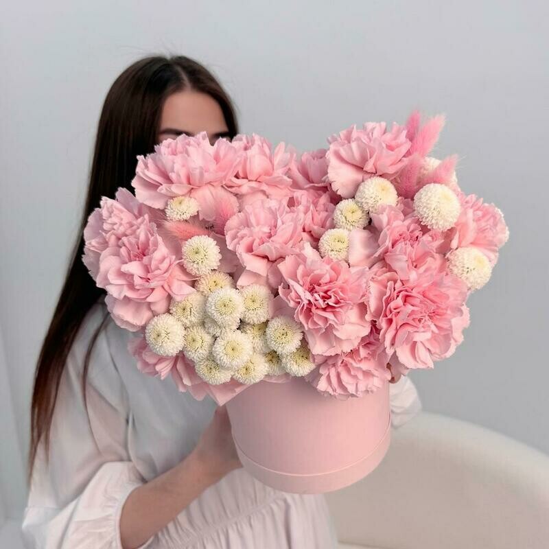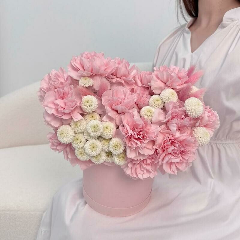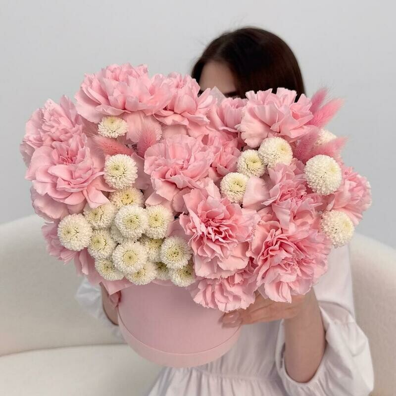 - Цветы в коробке: диантус, хризантема Размер М