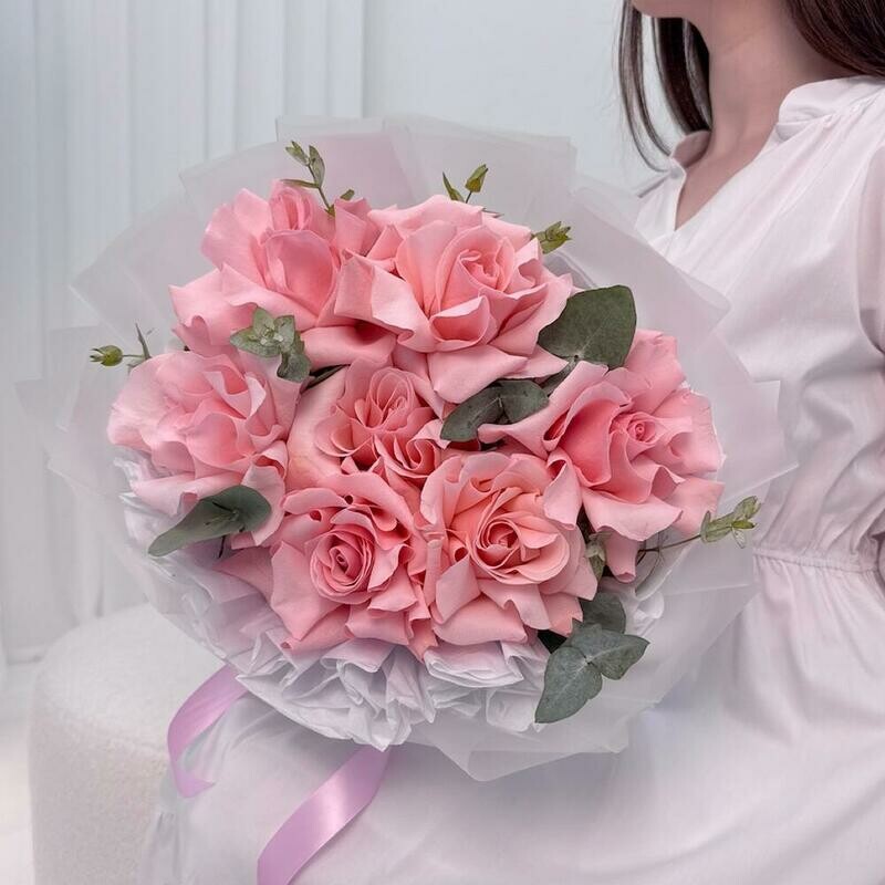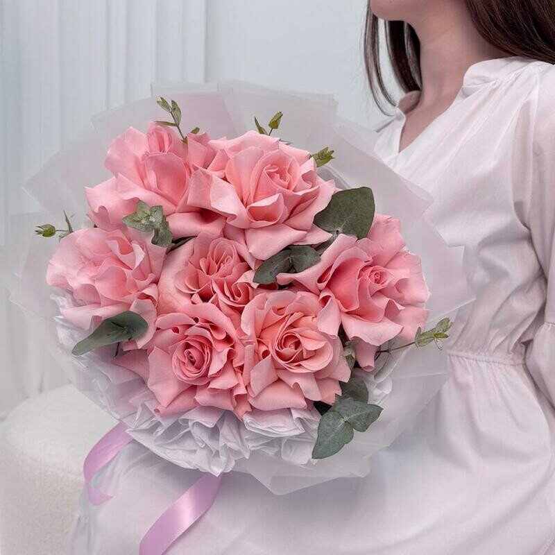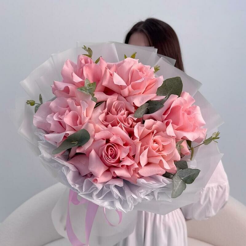 - Французские розовые розы (вывернутые розы) с эвкалиптом в дизайнерской упаковке Размер L