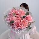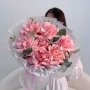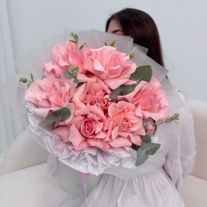 Французские розовые розы (вывернутые розы) с эвкалиптом в дизайнерской упаковке Размер L