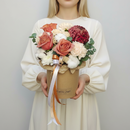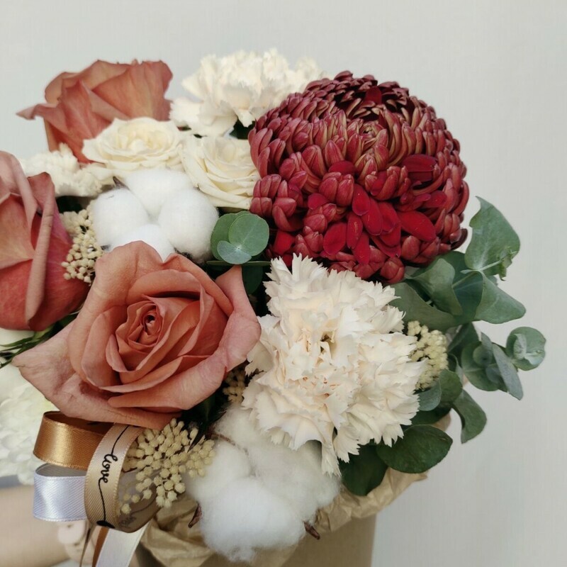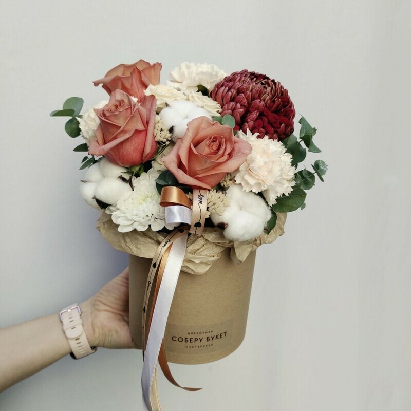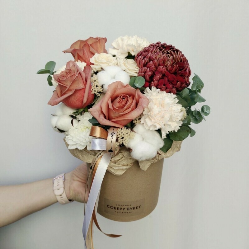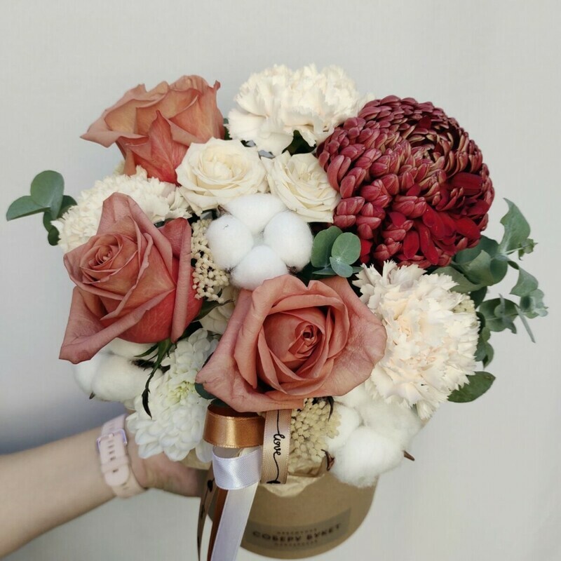 - Композиция в шляпной коробке с кофейными розами, гвоздиками и хризантемой.