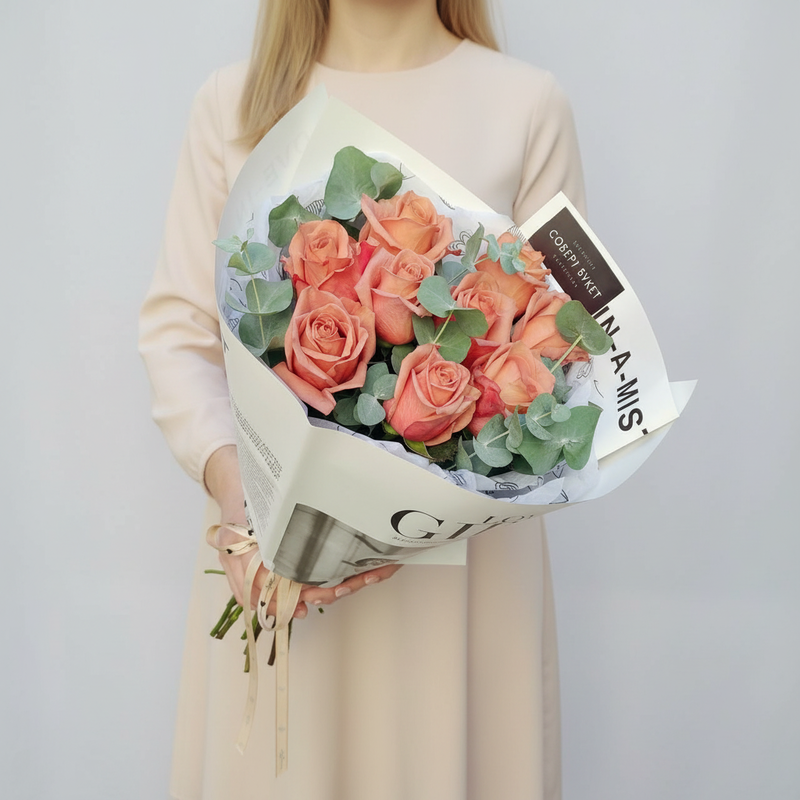 Букет из 9 роз кофейного цвета с эвкалиптом