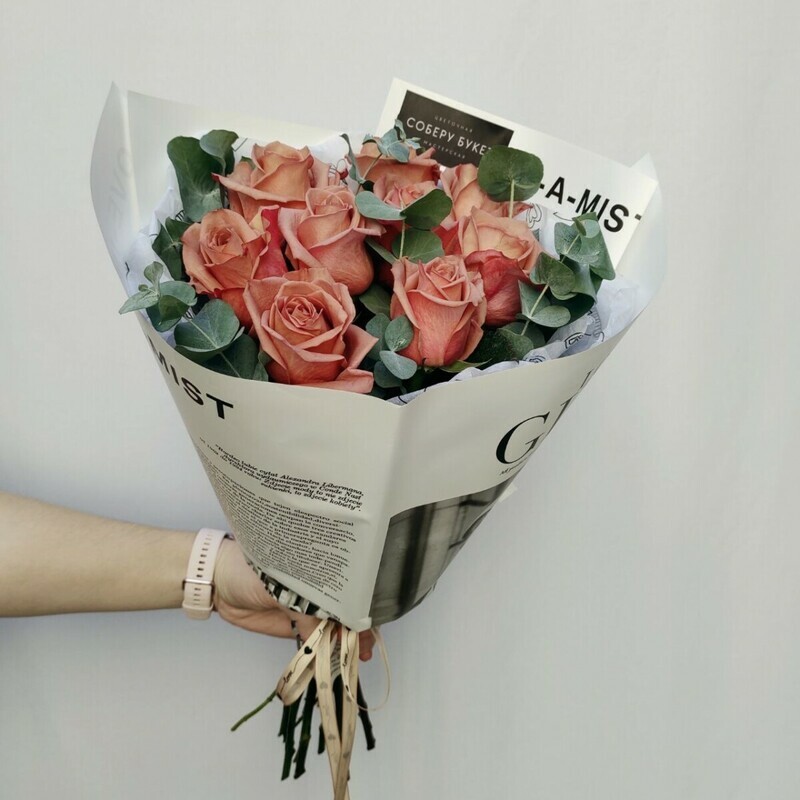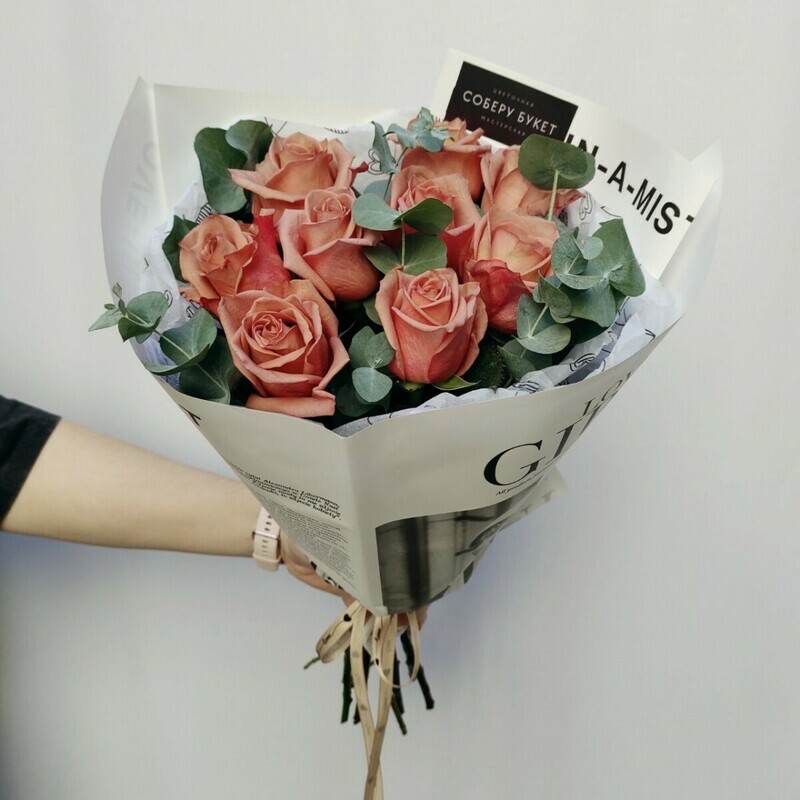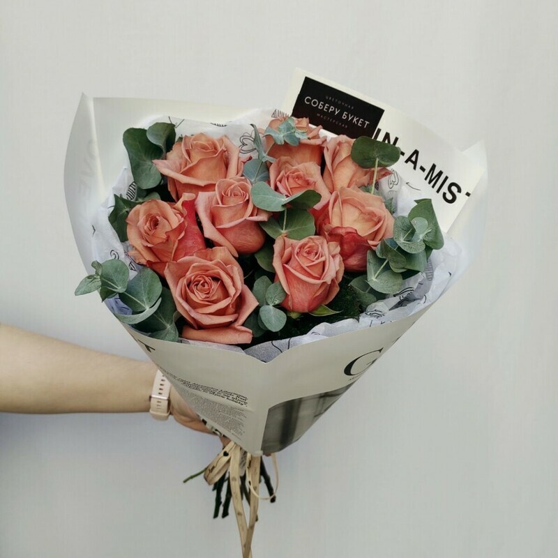 - Букет из 9 роз кофейного цвета с эвкалиптом