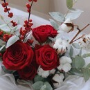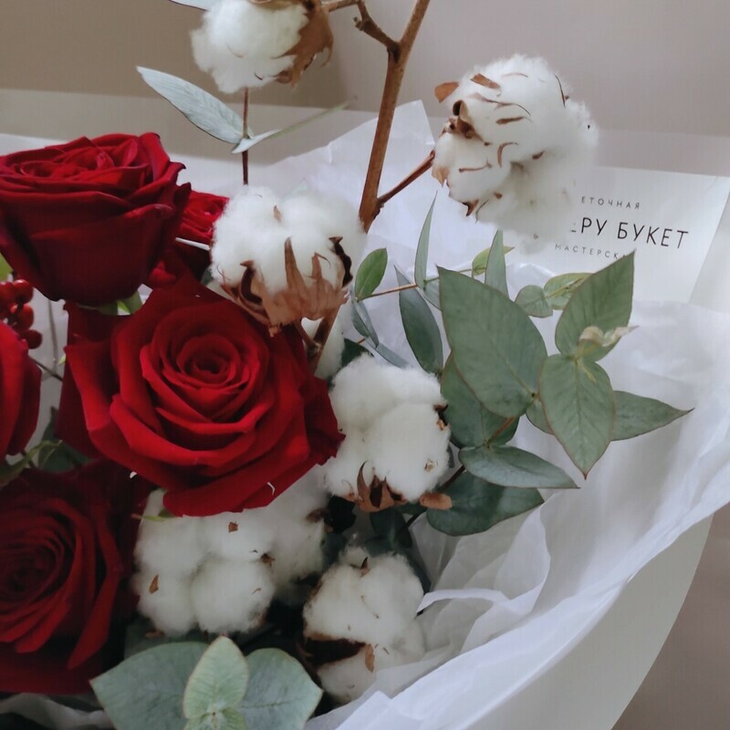 - Букет с хлопком, красными розами и илексом