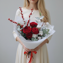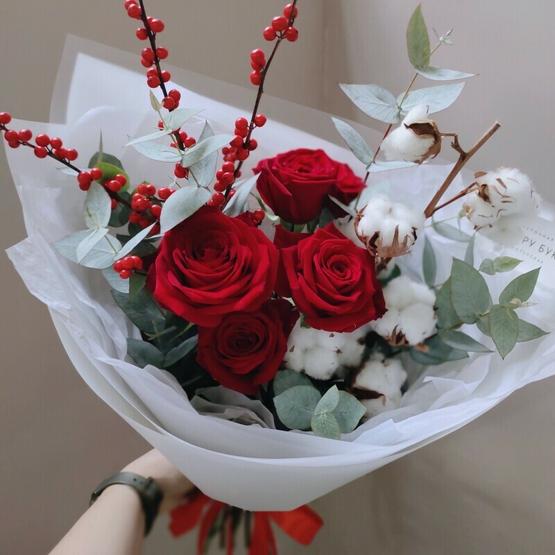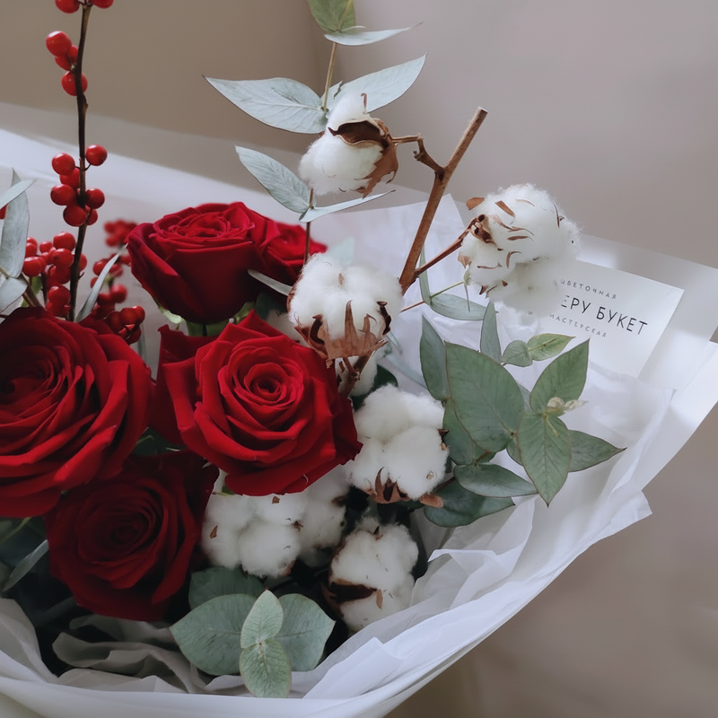 Букет с хлопком, красными розами и илексом