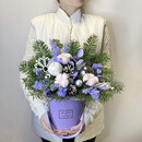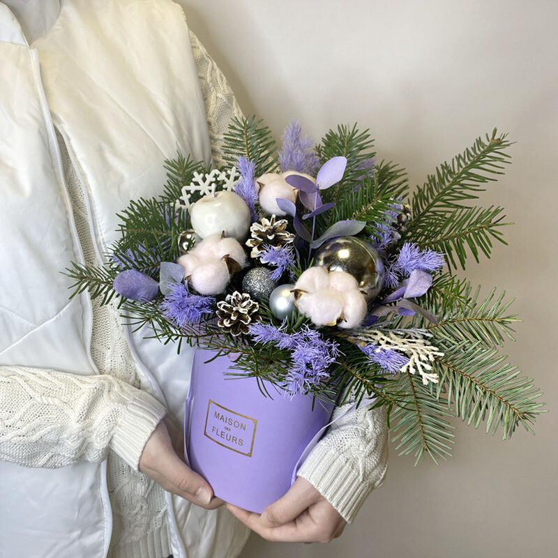 «Зимний сад» — хрупкая красота застывшего мгновения Эта композиция — настоящий миниатюрный сад, остановившийся в самый прекрасный зимний миг. Пушистая ветка благородного нобилиса и серебристый крашеный эвкалипт создают основу, похожую на заснеженные деревья. Ажурные ветви стабилизированного аспарагуса, подобно инею, покрывают пространство изящным кружевом. Нежно-розовый хлопок и белый декор добавляют мягкости, напоминая о первом пушистом снеге, а серебряные шары и шишки — словно драгоценные украшения, спрятанные среди ветвей. Всё это великолепие укрыто хрустальной снежинкой и бережно упаковано в прозрачную плёнку, позволяя любоваться садом со всех сторон.