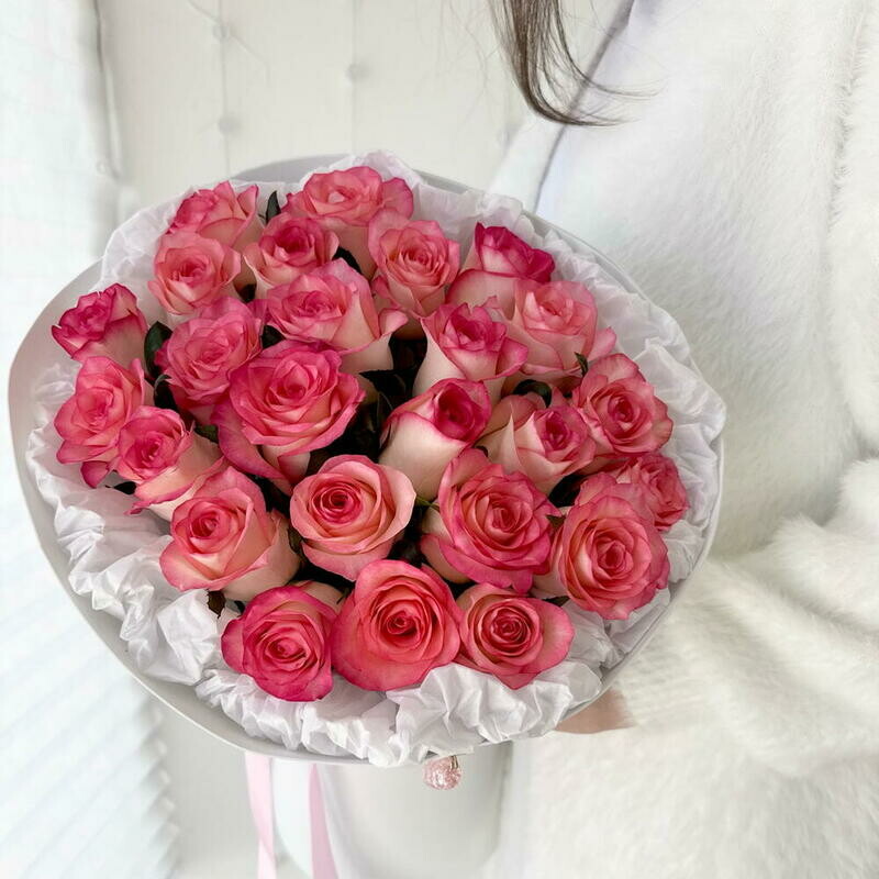 Букет розовых роз 25 штук в дизайнерской упаковке Размер М