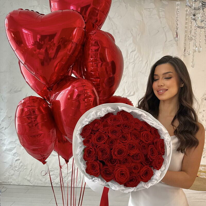 Подарочный набор: букет из 35 красных роз + шары с гелием сердце 9 шт