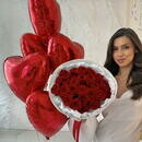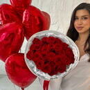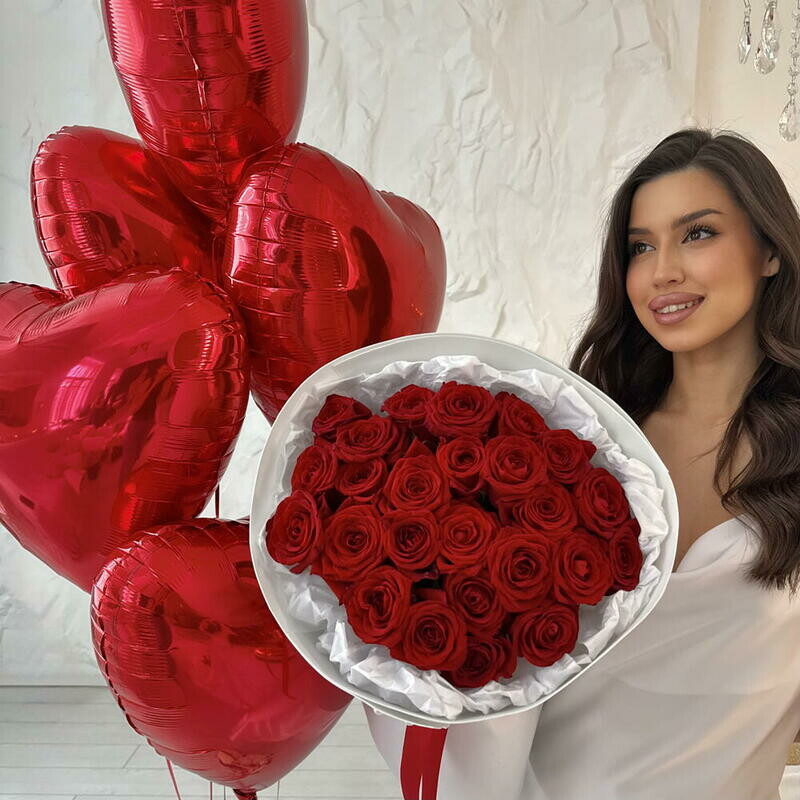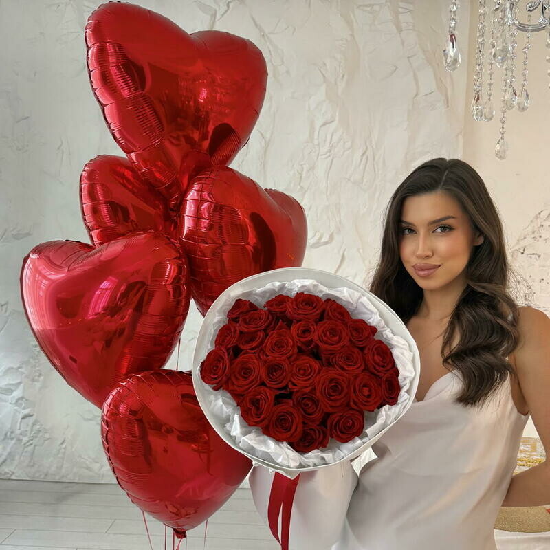 Подарочный набор: букет из 25 красных роз + шары с гелием сердце 5 шт