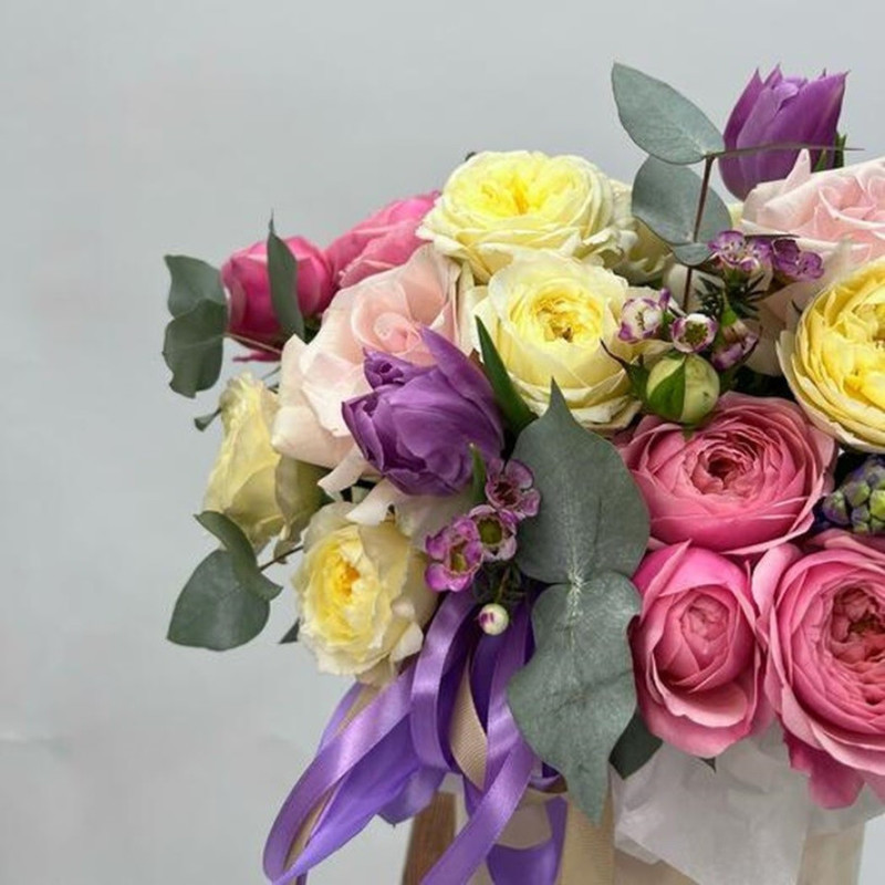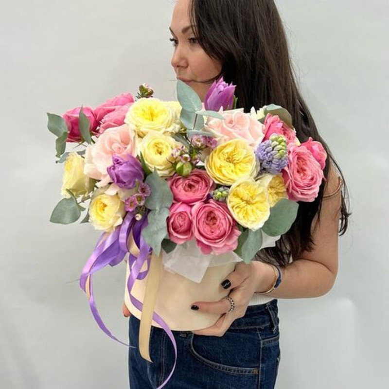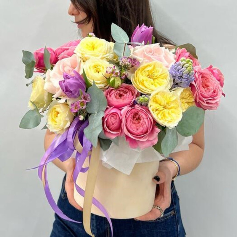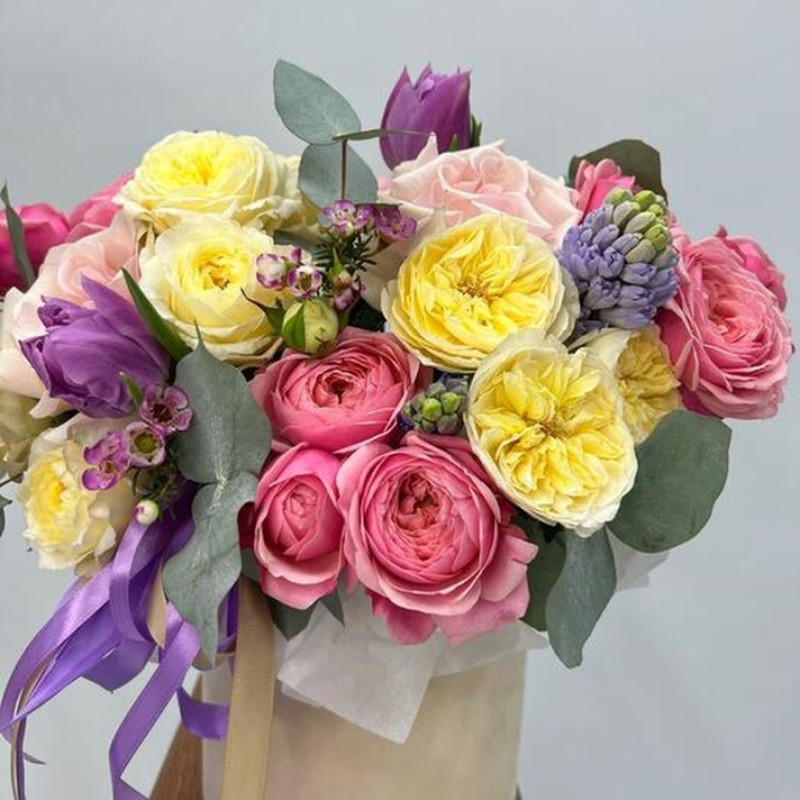 - Композиция в цилиндре из пионовидных розы, гиацинтов, тюльпанов, эвкалипта