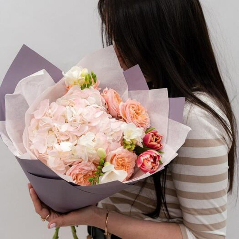 - Нежный розовый букет цветов из гортензии, ароматной фрезии, Тюльпанов и пионовидной кустовой розы