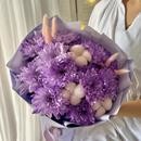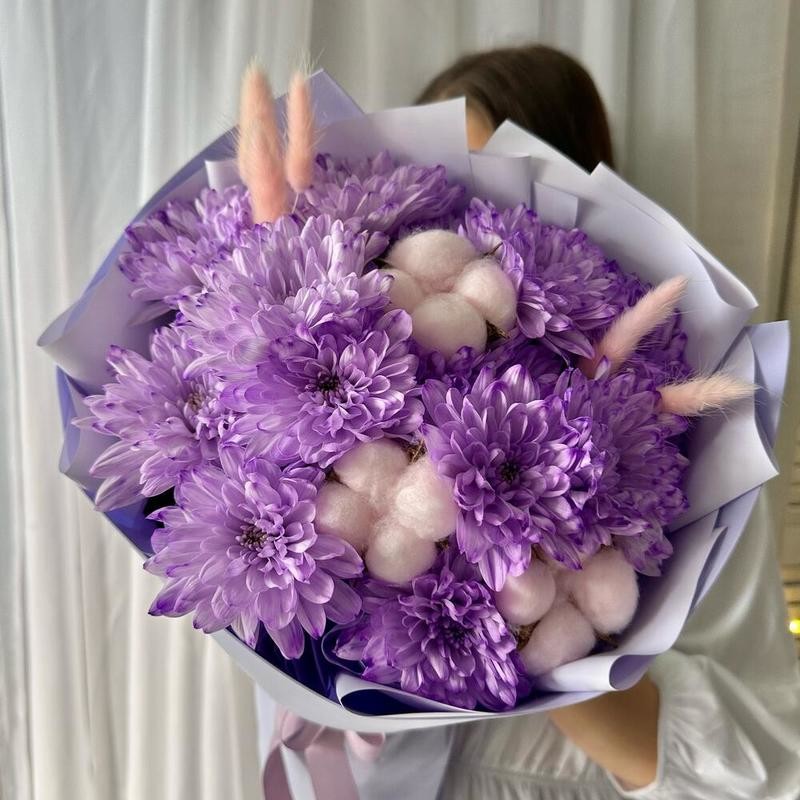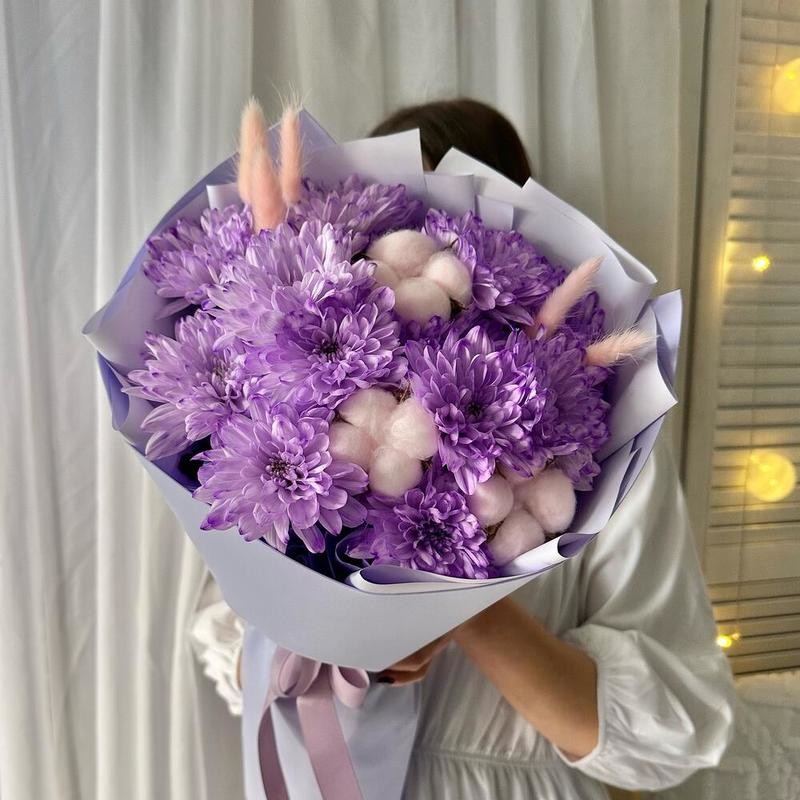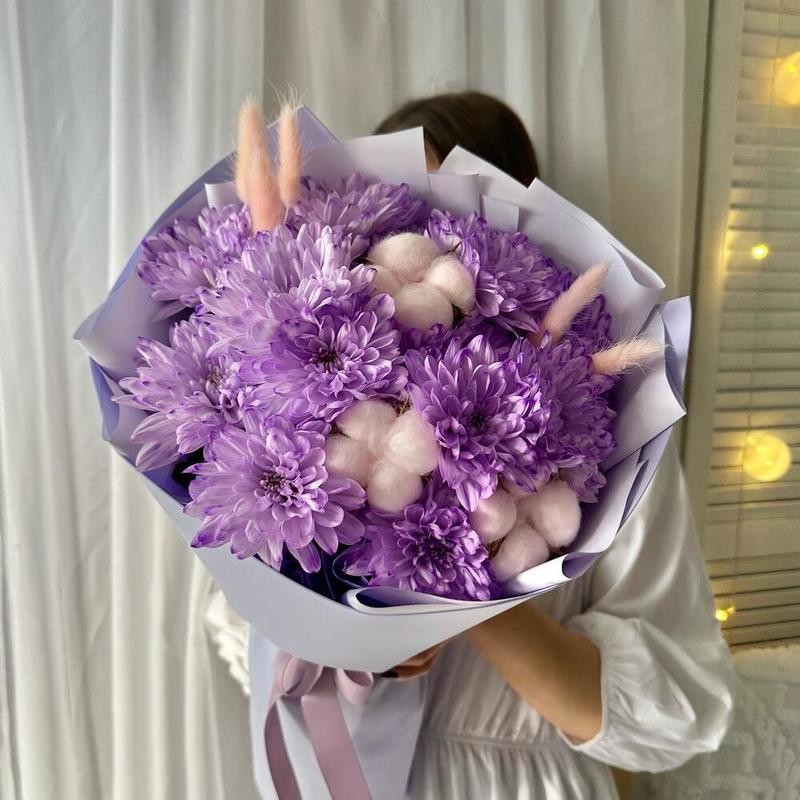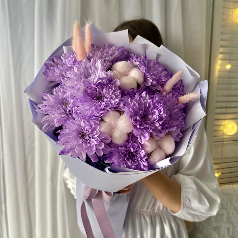 - Авторский букет: сиреневая хризантема, натуральный хлопок, лагурус