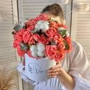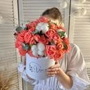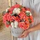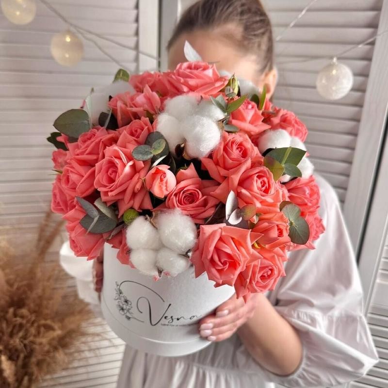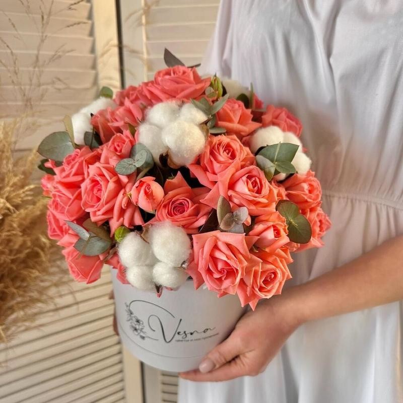 Очень эффектная, яркая коробочка с коралловыми розами) Цветы установлены в специальную губку с водой)