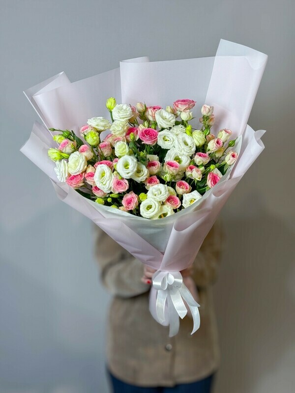 Идеальное сочетание кустовой розы и нежной эустомы в результате дают объёмный нежный букет для любого случая жизни.
