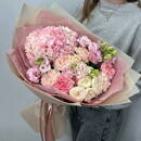 - Букет с розовой гортензией ,кустовыми розами ,диантусами и эустомой